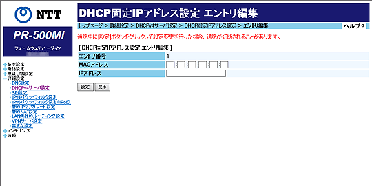 [DHCP固定IPアドレス設定 エントリ編集]