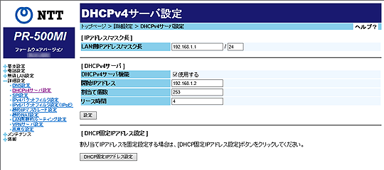 割当IPアドレスを固定する場合は、[DHCP固定IPアドレス設定]をクリックします。
