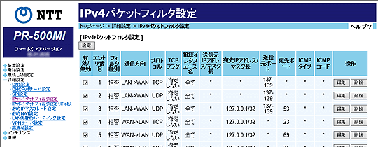 IPv4パケットフィルタ設定