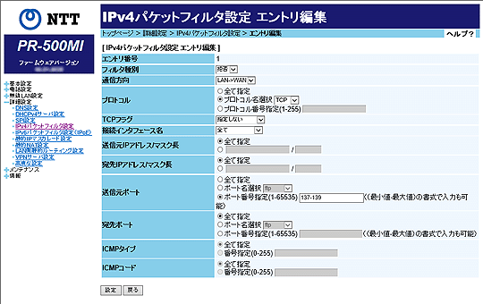 [IPv4パケットフィルタ設定 エントリ編集]