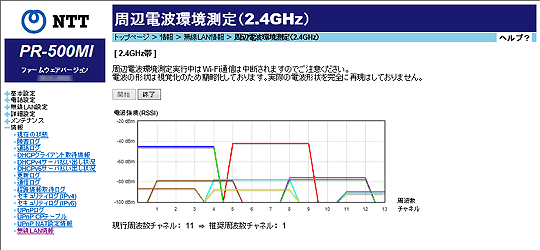 [周辺電波環境測定(2.4GHz)]をクリックすると、本商品周辺の2.4GHz帯を使用中の無線LANアクセスポイントの使用周波数帯などの詳細な電波環境を表示します。