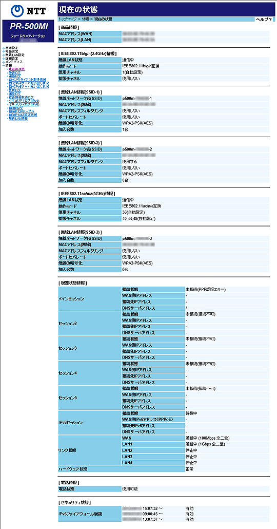- 現在の「IPv6セッション」の接続状態を表示します。