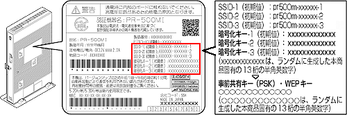 | 無線ネットワーク名(SSID) | pr500m-xxxxxx-1 (xxxxxxは本商品のWAN側のMACアドレスの下6桁) |