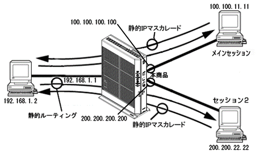 上記のような設定を行った場合には、[セッション2](WAN側)と本商品内のWebサーバ(LAN側、IPアドレスは'192.168.1.2')は、直接通信できます。