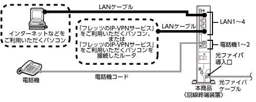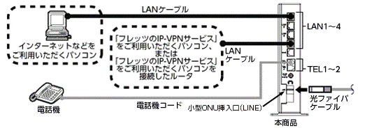 「フレッツのIP-VPNサービス」では、セキュリティの高い拠点間通信をサービスコンセプトとしており、1台のルータ・パソコンでVPN接続とインターネット接続を同時に利用しないことを推奨しておりますので、ひかり電話をご利用の場合は、以下の接続設定を行ってください。