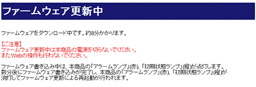 - 本商品を工場出荷状態で起動したときに、最新のファームウェアが提供されている場合は、自動的に最新のファームウェアへ更新されます。最新のファームウェアをダウンロード後、本商品が再起動しますので、10分ほどお待ちください。