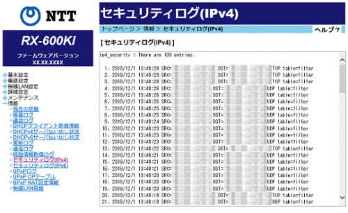 セキュリティログ(IPv4)には、受信したIPv4パケットについて廃棄した履歴を表示します(最大100件)。
