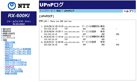 UPnPログは以下の項目を表示します。(最大100件)