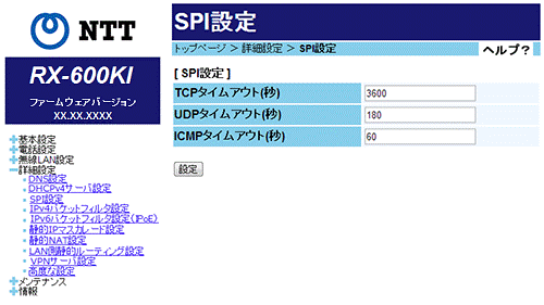 SPI機能を使用する際のIPアドレス/ポート番号の動的変換テーブルの有効保持時間(秒)を設定します。