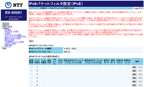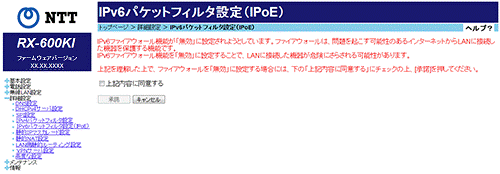 IPv6ファイアウォール機能を「無効」にした場合、IPv6パケットフィルタ設定(PPPoE)も無効となりますのでご注意ください。