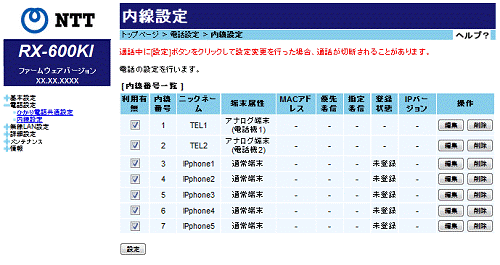 - [内線設定(IP端末)]の編集画面が表示されますので、そちらの画面で編集・設定します。
