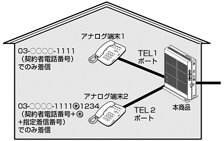 ※「本商品の設定」ページの[電話設定] — [内線設定]の [アナログ端末(電話機1)] / [アナログ端末(電話機2)] 画面で[電話番号設定]の[指定着信機能]にチェックし、[指定着信番号]に「1234」(指定着信番号)を入力します。