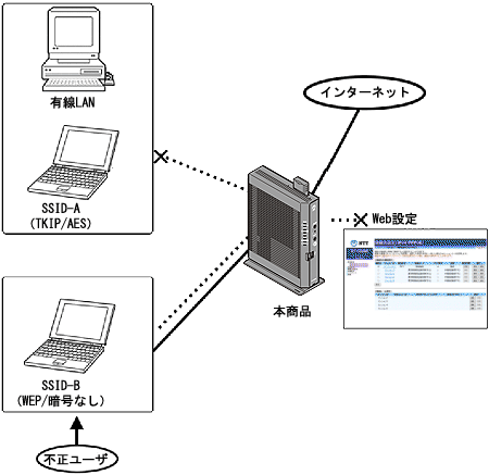 ポートセパレートを使用することによって、悪意ある第3者に、暗号化方式を「WEP」または「なし」に設定しているSSIDに不正に侵入された場合でも、被害を最小限に止めることができます。