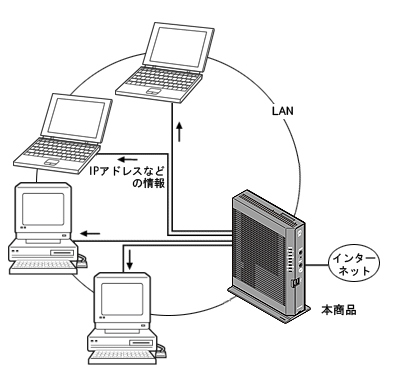 DHCP(Dynamic Host Configuration Protocol)サーバとは、LAN上のパソコンが起動すると、その都度、IPアドレスなどのネットワーク利用に必要な設定情報を、本商品から各パソコンに自動的に割り当てる機能です。