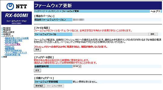 - 本商品のファームウェアの更新中や、ファームウェアの更新予約中、本商品の再起動を行っている場合、当社のひかり電話設備の工事中、他の設定を実行中は、本商品へのバージョンアップ操作は行えません。