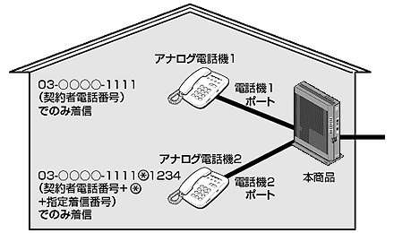 - 「03- ○○○○ -1111」でかかってきた場合は、アナログ電話機1のみ着信させる。