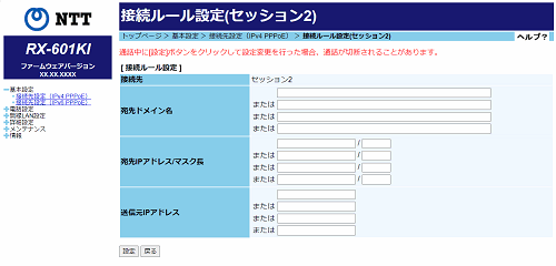 - 「基本設定」-「接続先設定(IPv4 PPPoE)」-[接続ルール設定]で、パケットの振り分けルールを設定する