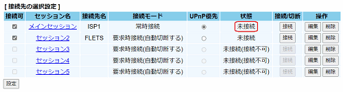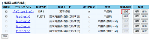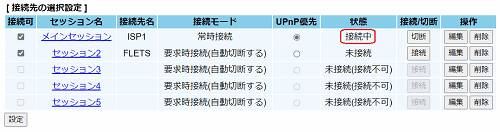 ここで[接続可]にチェックを入れた接続先で、PPPoEマルチセッションを行うことができます。 - [設定]をクリックする