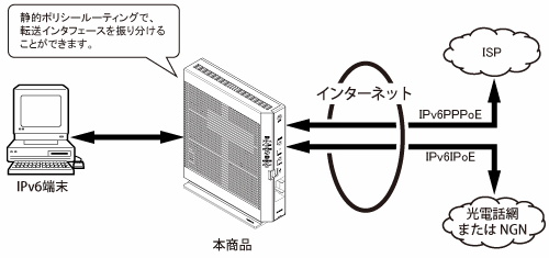 本機能は、ご契約のプロバイダが、IPv6 PPPoE方式によるインターネット接続を提供している場合、パケット振り分けルールを設定することにより、転送先をIPv6セッション(IPv6PPPoEインタフェース)とIPv6IPoEインタフェースへ振り分けることが可能です。