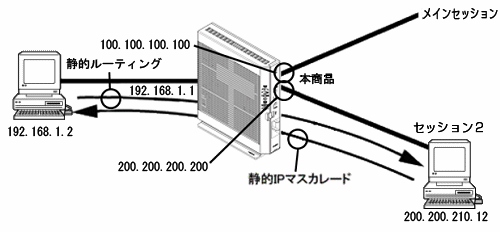 上記のような設定を行った場合には、[セッション2](WAN側)と本商品内のWebサーバ(LAN側、IPアドレスは'192.168.1.2')は、直接通信できます。