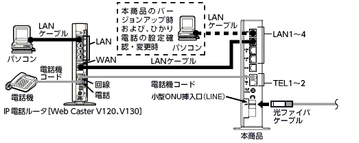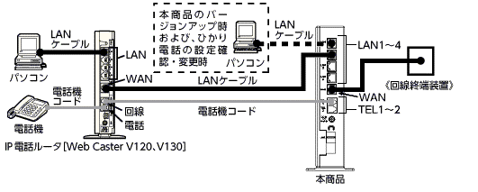 ※IP電話ルータ(Web Caster V120/V130)と本商品を下記の機器構成で接続した場合のみ動作確認を行っております。それ以外の機器構成でのご利用は推奨しません。
