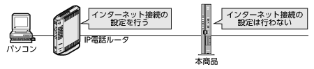 インターネット接続の設定(プロバイダから提供される接続先ユーザ名・接続パスワードなど)は、IP電話ルータにて行ってください。本商品には設定しないでください。 ![]() インターネット接続の方法は、IP電話ルータの設定ガイドをご覧ください。 パソコンなどはIP電話ルータに接続してください。 |