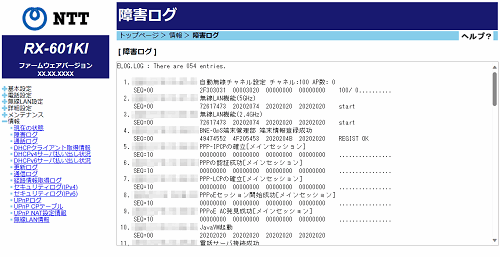 障害ログには、本商品の障害、通知、復旧などの動作履歴を表示できます。