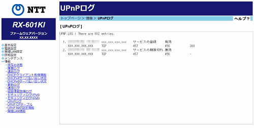 UPnPログにはUPnPの状態変化に関する履歴を表示します。