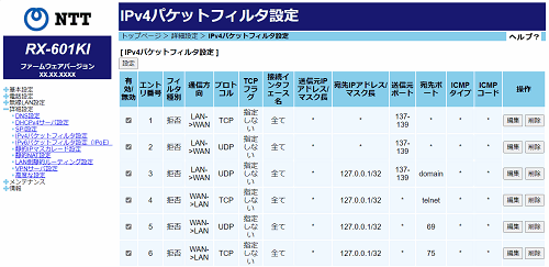 IPv4パケットフィルタ設定
