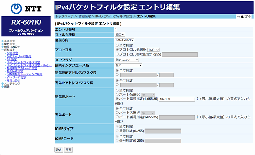 [IPv4パケットフィルタ設定 エントリ編集]