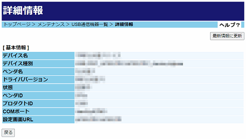 確認後、[戻る]ボタンをクリックし、「USB通信機器一覧」画面に戻ります。