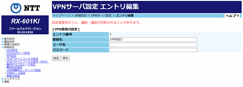「VPNサーバ設定 エントリ編集」画面が表示されます。