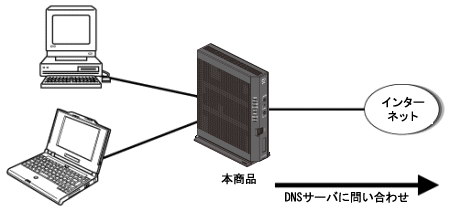 DNS Proxyとは、LAN上の各パソコンなどからのDNSの問い合わせパケットを受け取ると、インターネット上の本来のDNSサーバにフォーワーディングして問い合わせ、IPアドレスを各パソコンなどに回答する機能です。LAN上のパソコンなどは、本商品がDNSサーバとして動作しているように見えます。