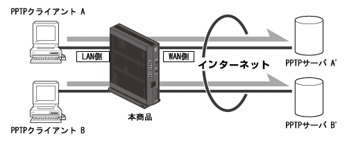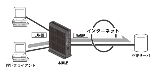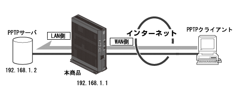 LAN側のPPTPサーバへWAN側のPPTPクライアントからアクセスする場合は、本商品へ静的IPマスカレード設定が必要です。LAN側に設置するPPTPサーバを静的IPマスカレード設定で、WAN側からアクセス可能にします。
