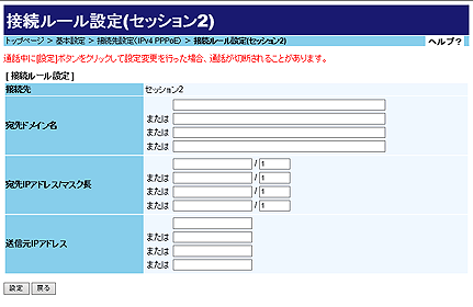 また、その他のセッションには、それぞれの「接続ルール設定」で、LAN側からWAN側へのパケット振り分けルールを設定します。