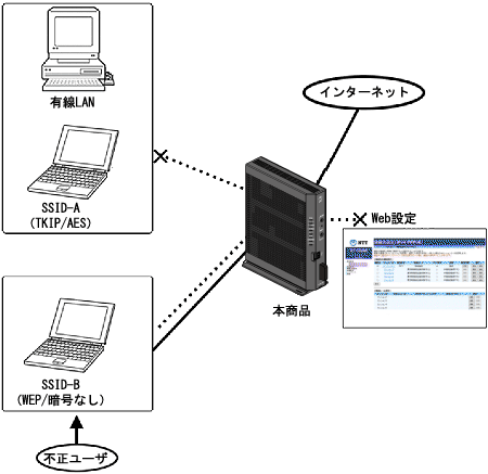 - 暗号化方式を「なし」に設定しているSSIDに属している無線LAN端末と、他のSSIDに接続している無線LAN端末および有線LAN端末との通信を遮断します。(同じSSIDに属している無線LAN端末同士の通信は可能です。)
