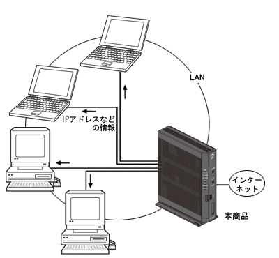 DHCP(Dynamic Host Configuration Protocol)サーバとは、LAN上のパソコンなどが起動すると、その都度、IPアドレスなどのネットワーク利用に必要な設定情報を、本商品から各パソコンなどに自動的に割り当てる機能です。