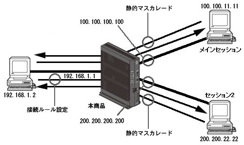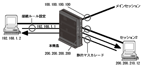 上記のような設定を行った場合には、[セッション2](WAN側)と本商品内のWebサーバ(LAN側、IPアドレスは'192.168.1.2')は、直接通信できます。