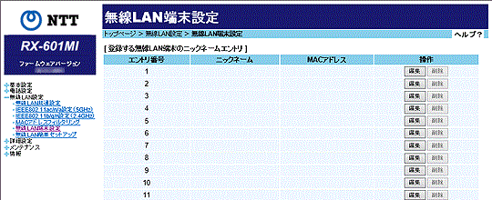- [登録する無線LAN端末のニックネームエントリ]の中から編集したいエントリ番号の「操作」欄の[編集]をクリックする
