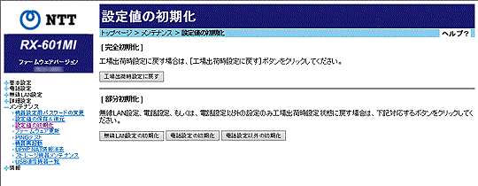 - [無線LAN設定の初期化]、[電話設定の初期化]または[電話設定以外の初期化]をクリックする