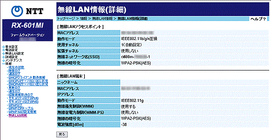 現在使用中の無線LAN端末の設定内容を表示します。