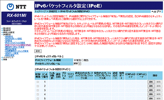 IPv6ファイアウォール機能(初期値:有効)