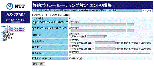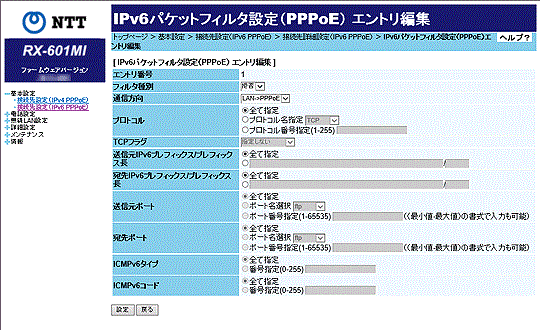 [IPv6パケットフィルタ設定(PPPoE)エントリ編集]