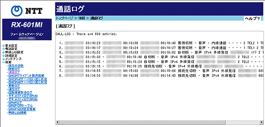 本商品で発着信した、あるいは内線通話・内線転送した相手の電話番号や時刻などの履歴情報が表示されます。