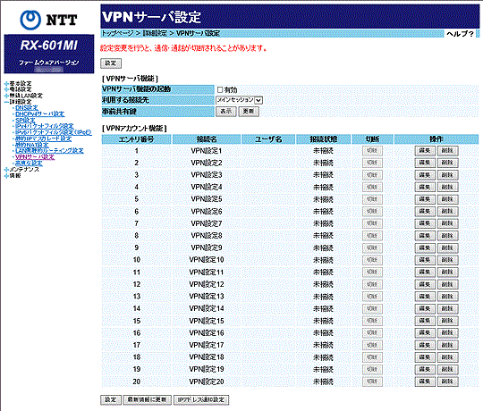 VPNアカウントの新規登録または設定内容を変更するときは[編集]をクリックします。設定したVPNアカウントを削除するときは[削除]をクリックします。