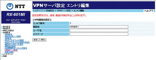 - 「エントリ編集」の画面で、「ユーザ名」と「パスワード」を入力する