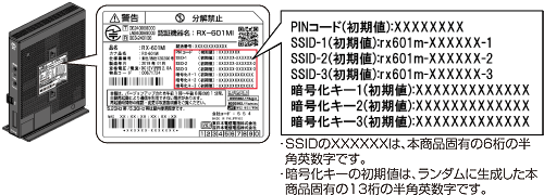| 無線ネットワーク名(SSID) | rx601m-xxxxxx-1 (xxxxxxは本商品のWAN側のMACアドレスの下6桁) |