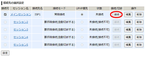 接続先は、メインセッション1箇所とその他の接続先を1~4箇所設定します。