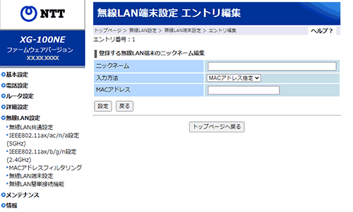 ※ 複数の[登録する無線LAN端末のニックネームエントリ]を編集する場合には、下記1~2のあと[戻る]をクリックし、[登録する無線LAN端末のニックネームエントリ]で編集したいエントリ番号の[編集]をクリックし、続けて設定します。