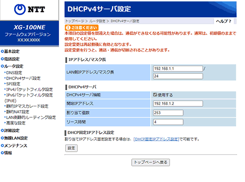 LANに別のDHCPサーバがある場合や、DHCPv4サーバ機能を使用しない場合には、 チェックを外します。